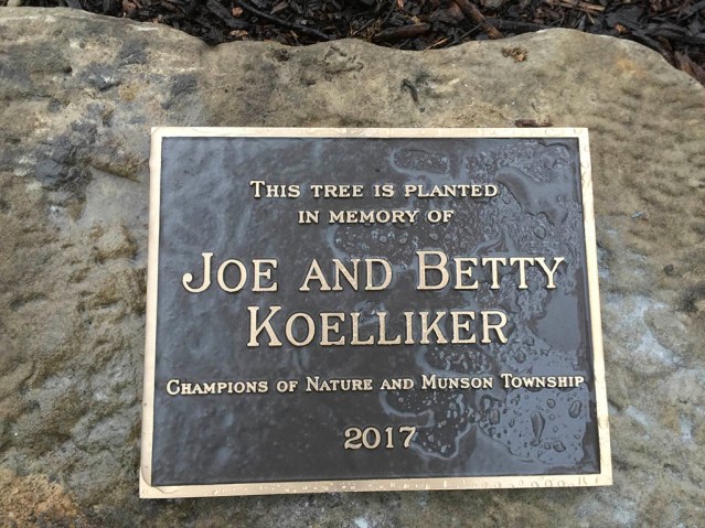 In memory of the Koellikers’ foresight and conservation ethic, Munson Township placed a commemorative plaque at the base of a newly planted red oak tree. It sits beside the Munson Town Hall. Various public officials spoke at the ceremony. State Senator John Ecklund spoke fondly of Joe and Betty. Each of the Township trustees Andy Bushman, Irene McMullen, and Jim McCaskey offered their thanks for what the Koellikers had preserved. A commendation written by State Representatives John Patterson and Sarah LaTourette was presented to Rachel Vanek, daughter of Betty and Joe, and resident of Munson Township with other family members were present.