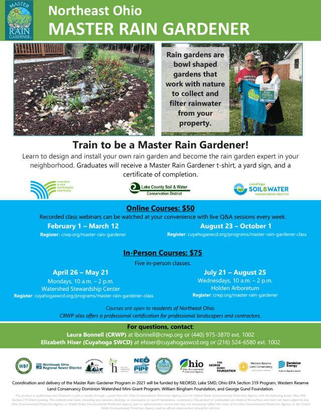 In partnership with Cuyahoga Soil & Water Conservation District and Lake County Soil & Water Conservation District, Chagrin River Watershed Partners will again be offering the Master Rain Gardener certification course for residents and professionals within Northeast Ohio. We would like to share this opportunity directly with our member communities, especially with any neighborhoods that may be experiencing flooding issues.This course will teach participants how to design, install, and maintain residential rain gardens. Each course offers a two-track option, where participants can choose to receive a residential Master Rain Gardener or a Professional Rain Gardener certification. The residential certification is geared toward homeowners who would like to install a rain garden in their own yard and serve as the neighborhood expert on rain gardens. The professional certification is geared toward landscape professionals and contractors looking to install rain gardens professionally on residential properties.